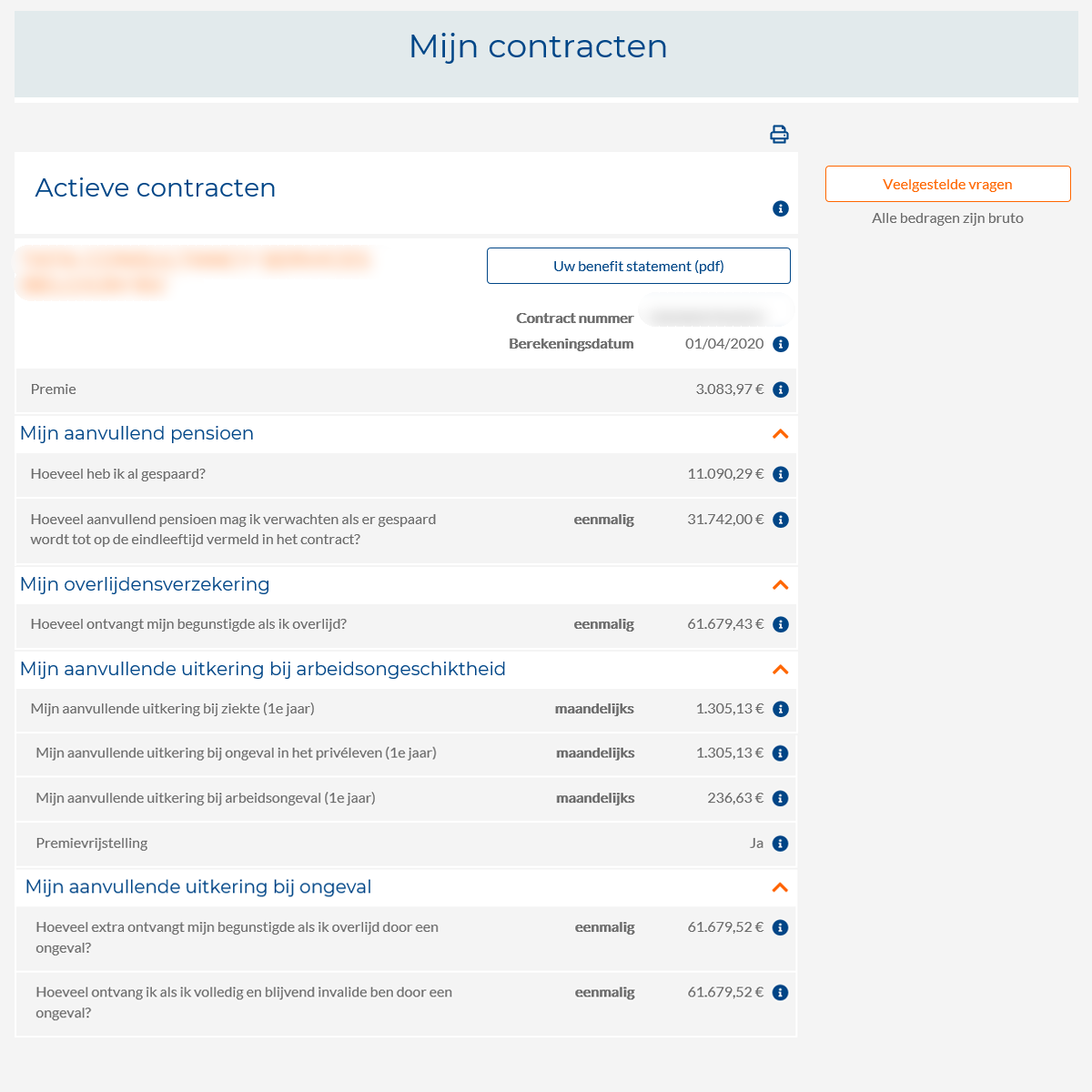 De nouvelles primes alimentent encore ces contrats. Il se peut exceptionnellement qu'aucune prime ne soit renseignée alors que votre contrat est actif. Par exemple parce que votre contrat de travail est (temporairement) suspendu (maladie de longue durée, interruption de carrière...). |